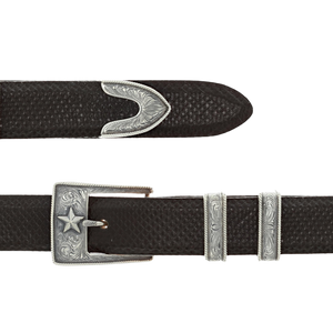 The Taylor 1805 Sterling Star On Buckle Set from Clint Orms Engravers & Silversmiths is a very popular choice for those looking to show off their love for the Lone Star State. This 1” sterling silver buckle set features a prominent sterling silver star on the buckle, a sterling silver rope edge and intricate engravings throughout each of the four pieces.Made and engraved by hand in Texas by Clint Orms Engravers & Silversmiths.