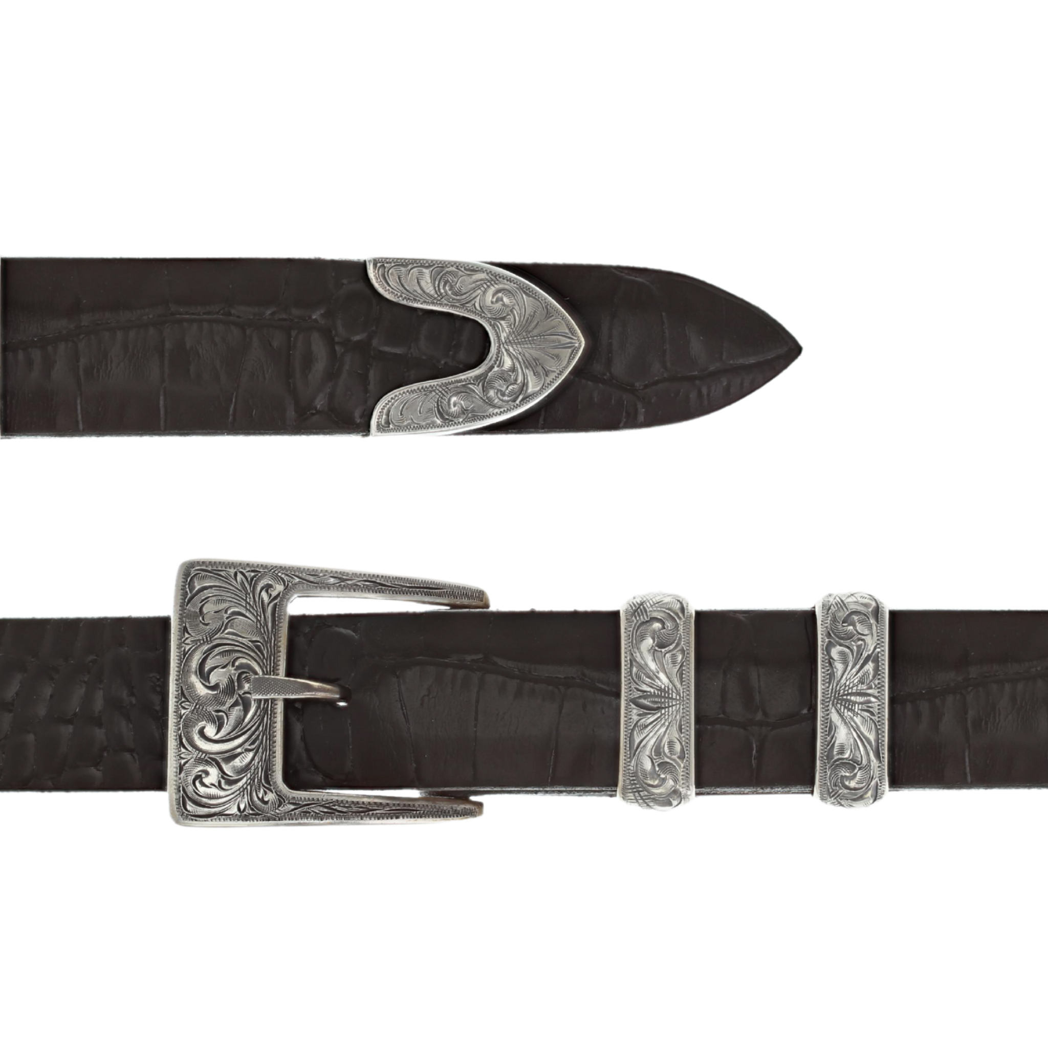 1" sterling silver four piece buckle set with scroll engraving. Made and engraved by hand in Texas by Clint Orms Engravers & Silversmiths.
