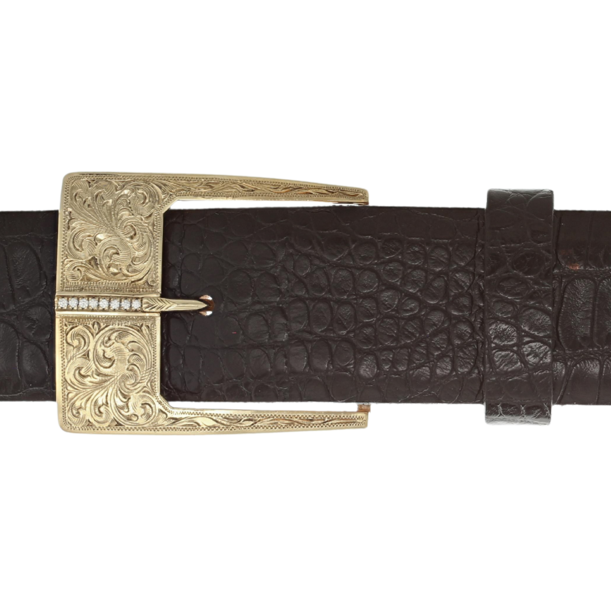 1.5" 14k yellow gold buckle with 3.5mm wide 14k yellow gold bar in center paveed with 8x 1.5mm diamonds. Engraved.