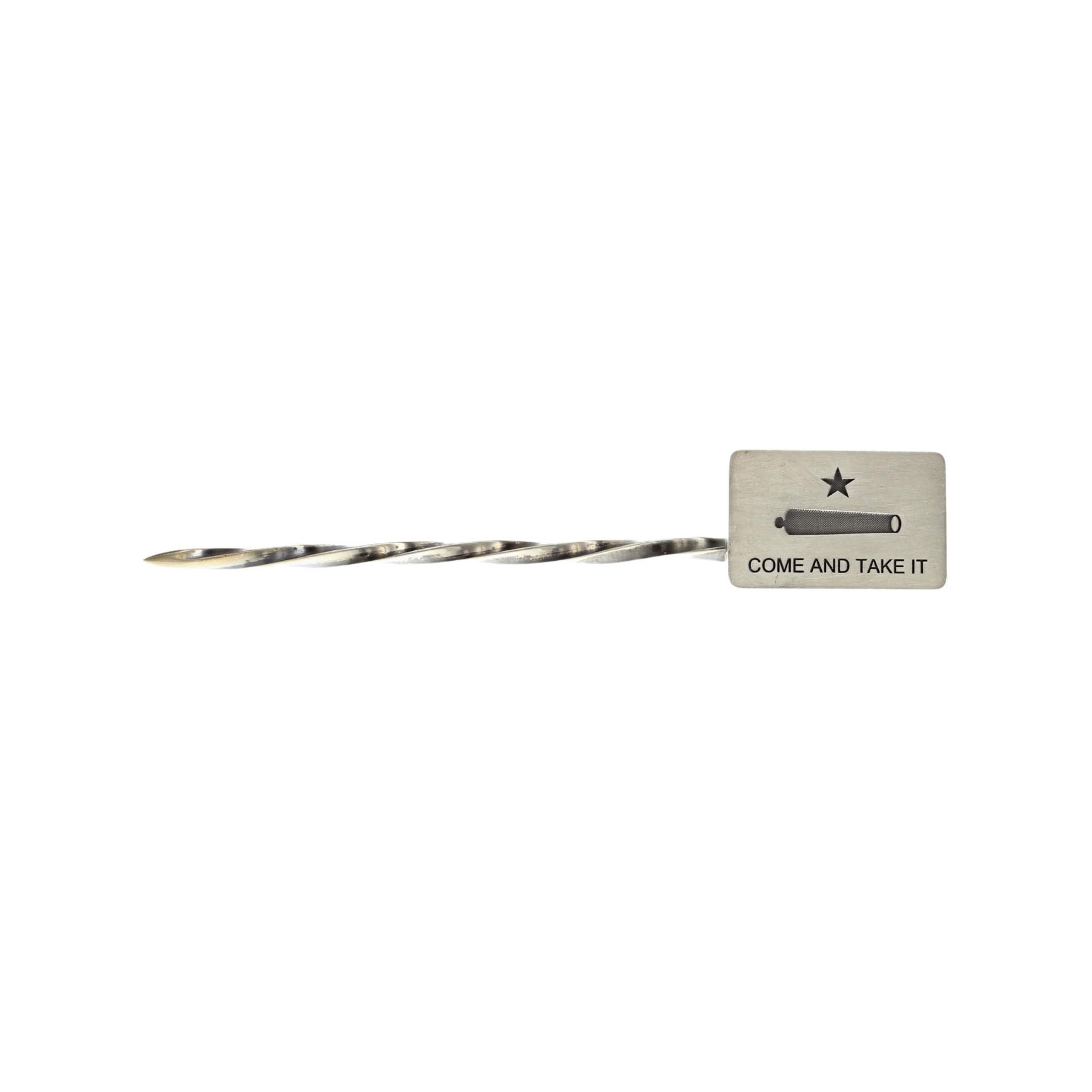 Sterling Silver 3" Twisted Toothpick with sterling silver Come and Take It flag on end. The toothpick-1807 makes the perfect accessory to match our Brandes-1807 trophy buckle.