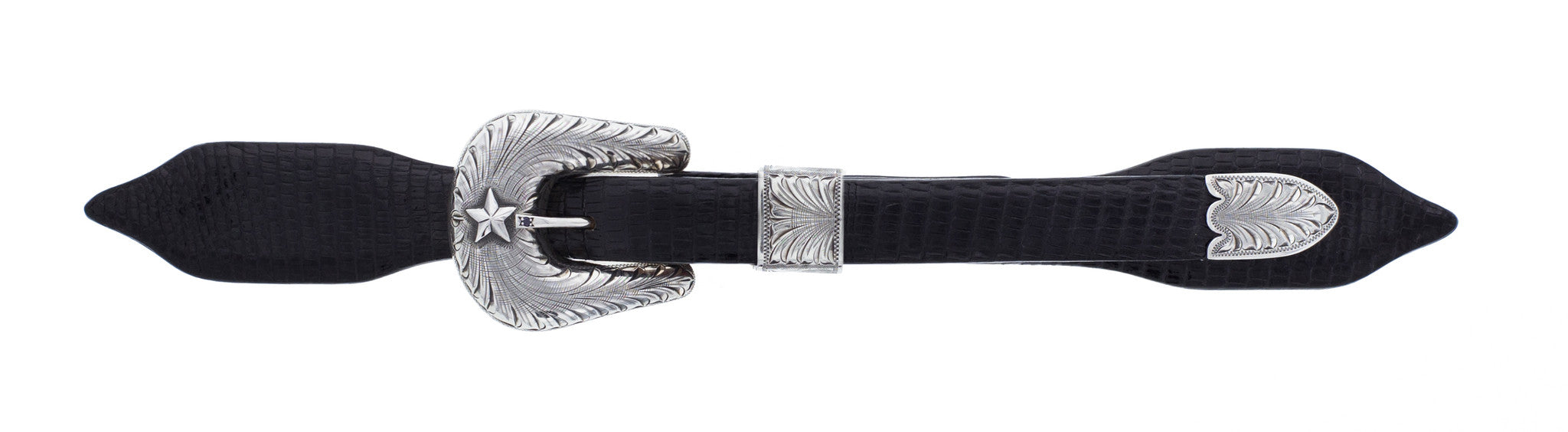 The Travis 1830 Star Buckle Set is a three-piece 3/4” buckle set with a sterling star on the buckle and a sapphire stone set into the tongue. This is the perfect choice for someone looking for a buckle set that is expertly crafted and intricately detailed, but in a very subtle way. This particular buckle is so popular, it was even worn by former U.S. President, George W. Bush.