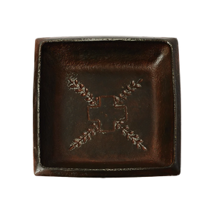 Cool and leathery wax cast valet tray with embossed cross and laurel