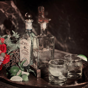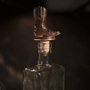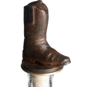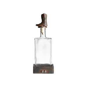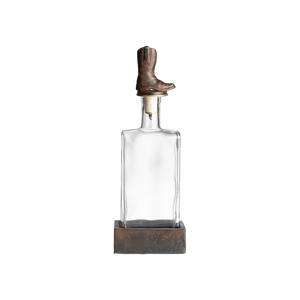 Cowboy boot wax cast iron decanter topper with slender glass bottle and thick cast iron coaster