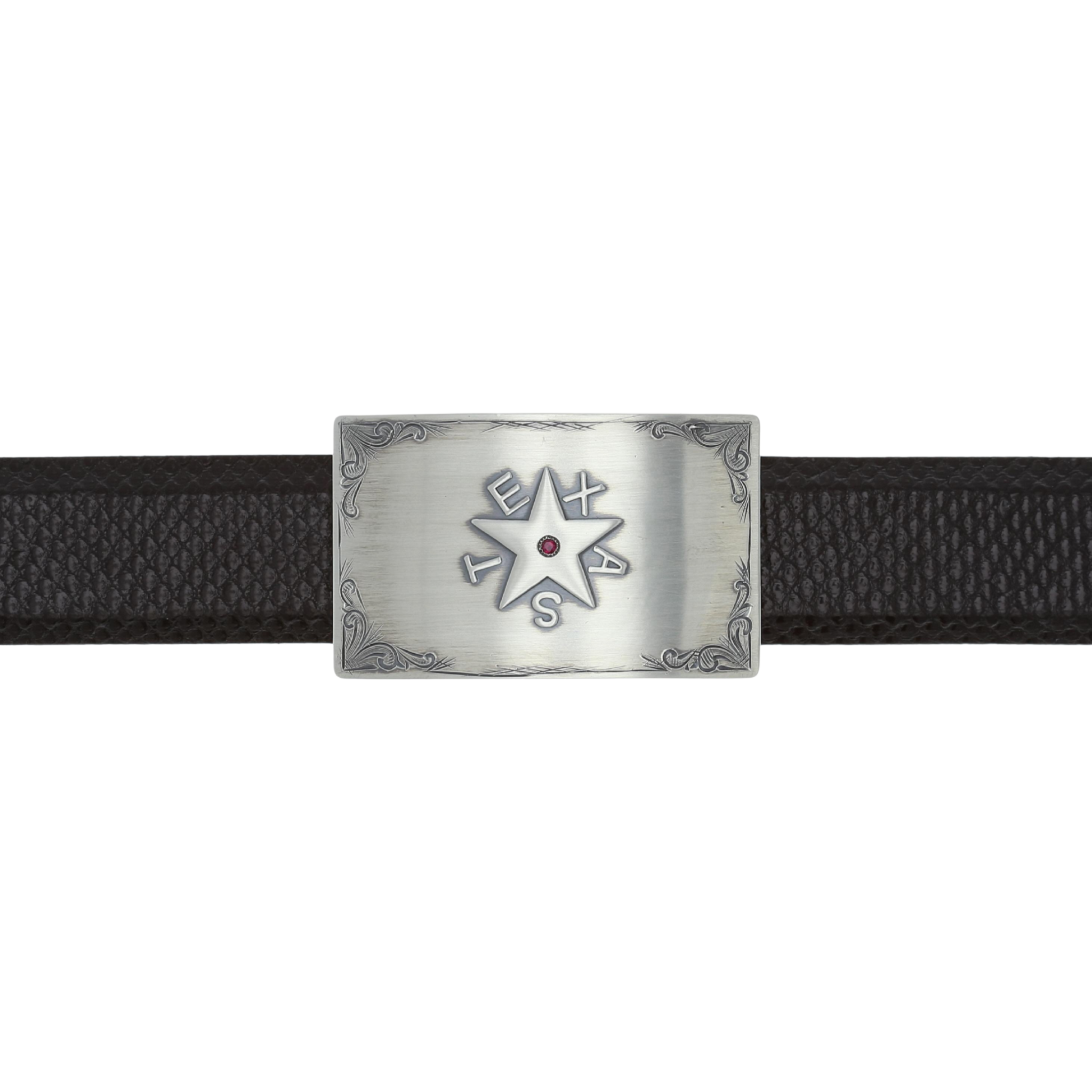 Our Zavala 1407 Sterling & Ruby Zavala Flag Trophy Buckle honors the buckle's namesake, the Zavala flag—the first official flag of Texas. This sterling silver trophy buckle features a Lone Star with the “TEXAS” letters surrounding the iconic design. A single 2 mm ruby sits at the center of the star for added interest. Refined scroll engravings frame the Zavala flag, and a satin finish completes the piece. The smaller frame fits a 1" straight or taper belt, perfect for the conservative wearer.