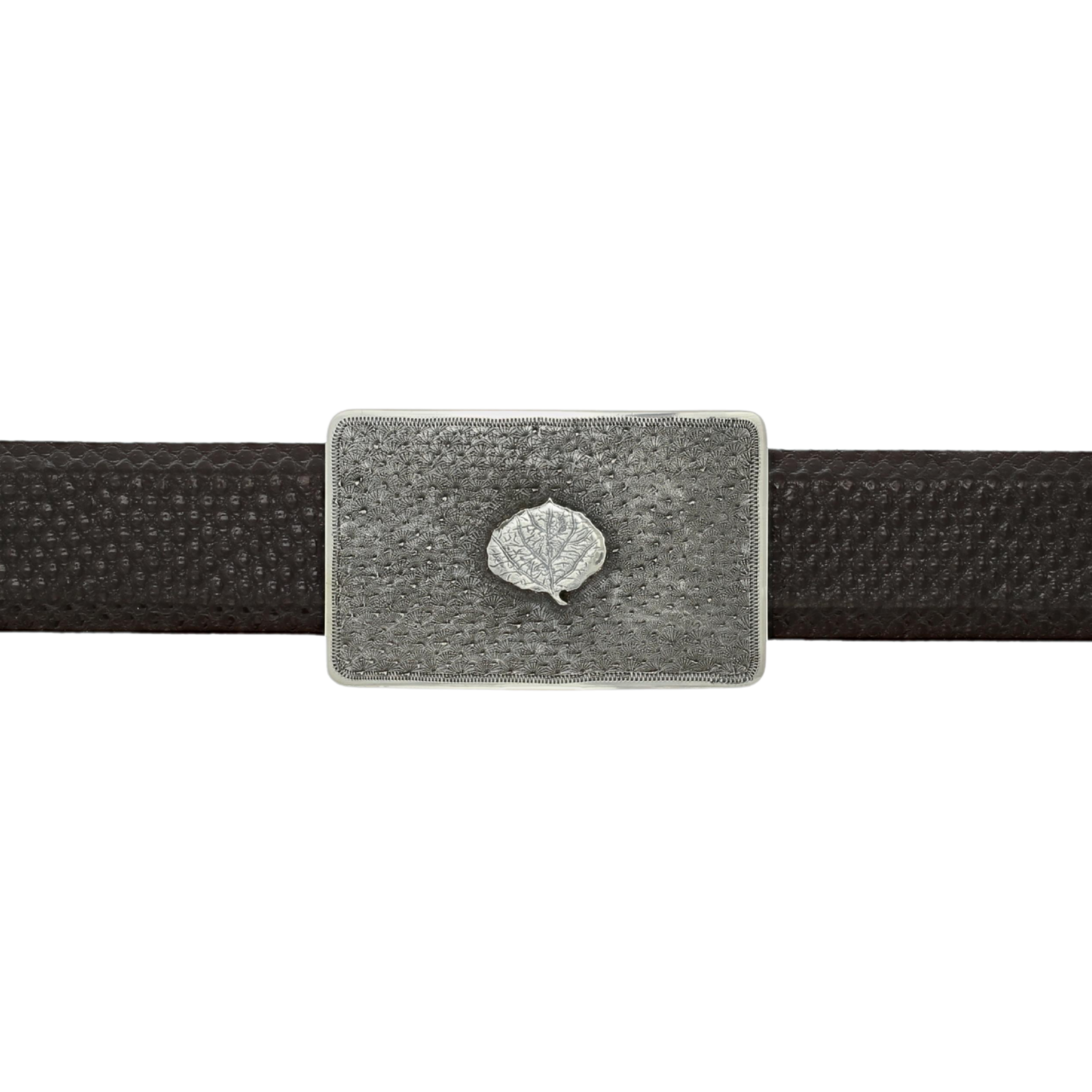 The Zavala 1601 is a stunning sterling engraved trophy buckle with a raised sterling aspen leaf at the center and a hand-engraved wheatgrass background. The 2.25" x 1.4" rectangular frame features a smooth border and rounded corners. Fits belts up to 1" wide.