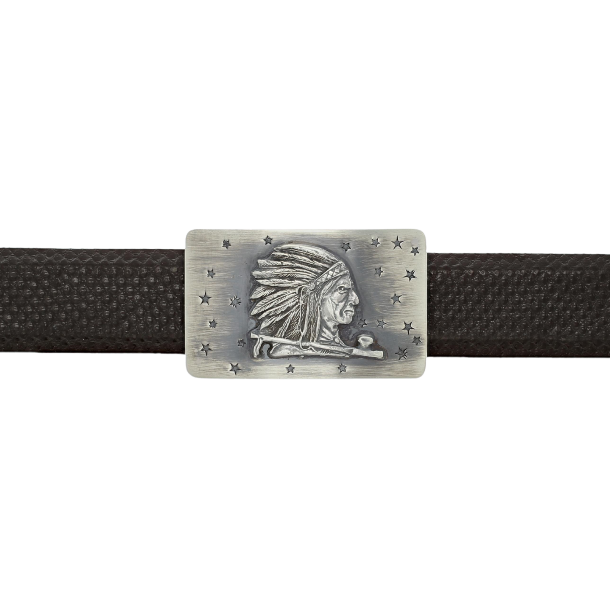2.25" x 1.4"' sterling silver rectangular trophy buckle with sterling silver Indian head, star stamped background, matte finish. Fits belts up to 1" wide. Made and engraved by hand in Texas by Clint Orms Engravers & Silversmiths.